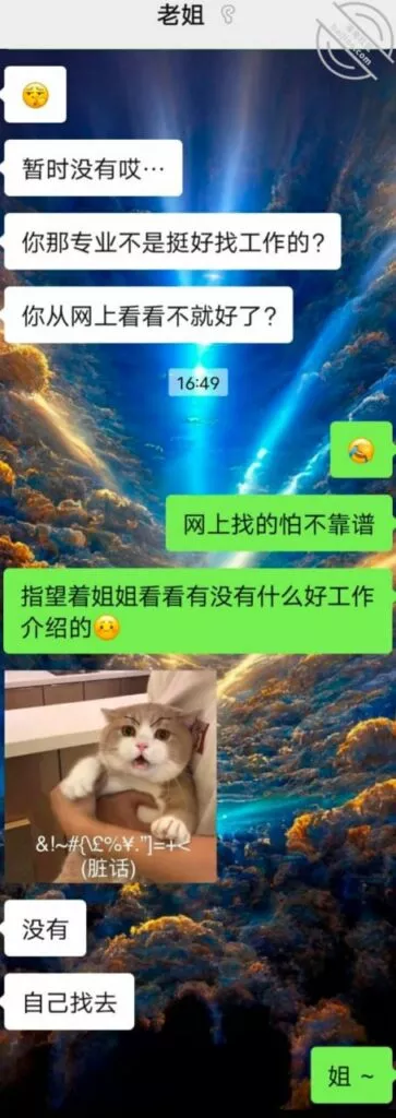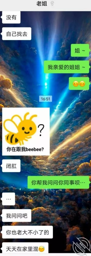 没想到哇,我去公司里加班的时候,我姐给我发消息了。。