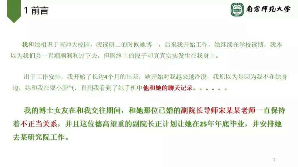 南京师范大学师德败坏事件,南京师大一男子曝料自己的博士生女友,长期与其导师宋某某保持不正当关系,其女友觉醒本质,成为学术妲己,高度绑定自己与导师的地下恋情相互利用,身体与学术地位在这一刻水孚交融,男子的师姐表示:没有挖不倒的墙角,只有不努力的小三。
