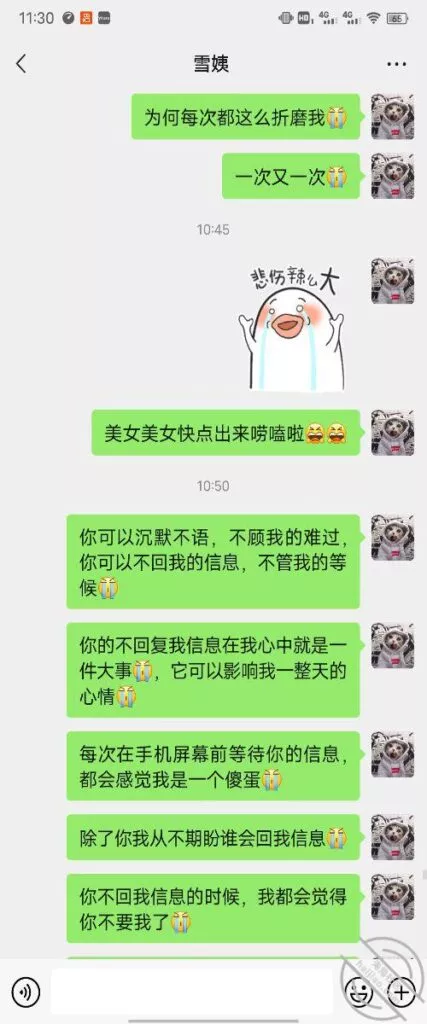 前天跟雪姨聊天聊到晚上十点左右雪姨就不理我了,我给雪姨发信息发了一晚上都没理我,我以为我说错了什么话啦,不理我了,等到上午十点了才回复我,说昨天不小心睡着啦,给我吓一身汗啊