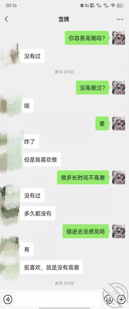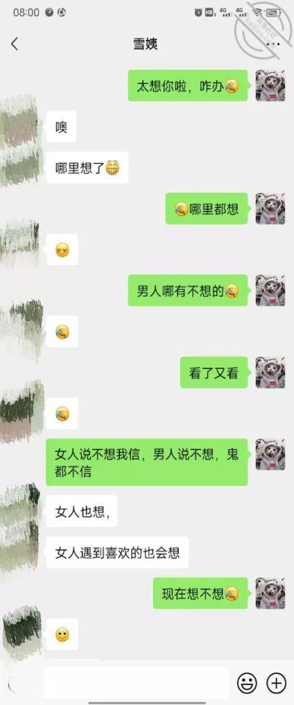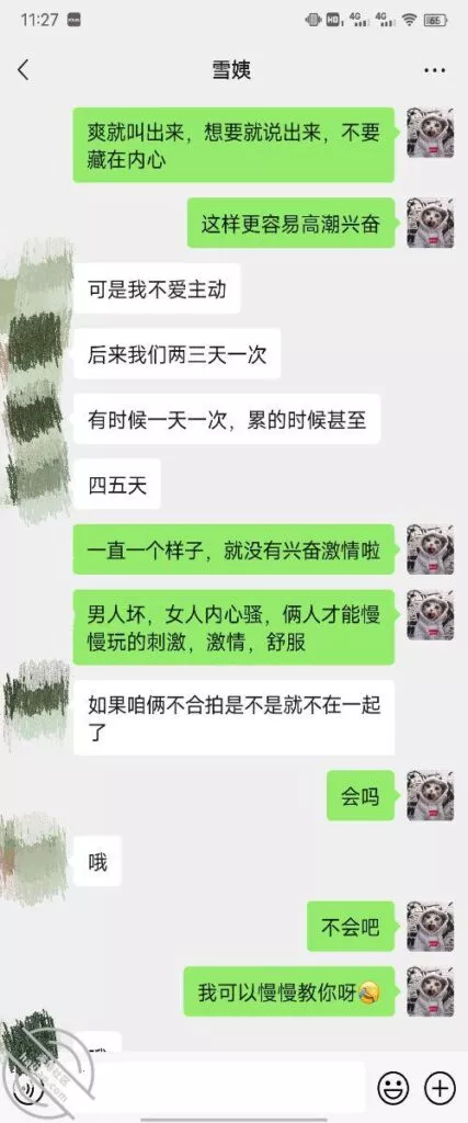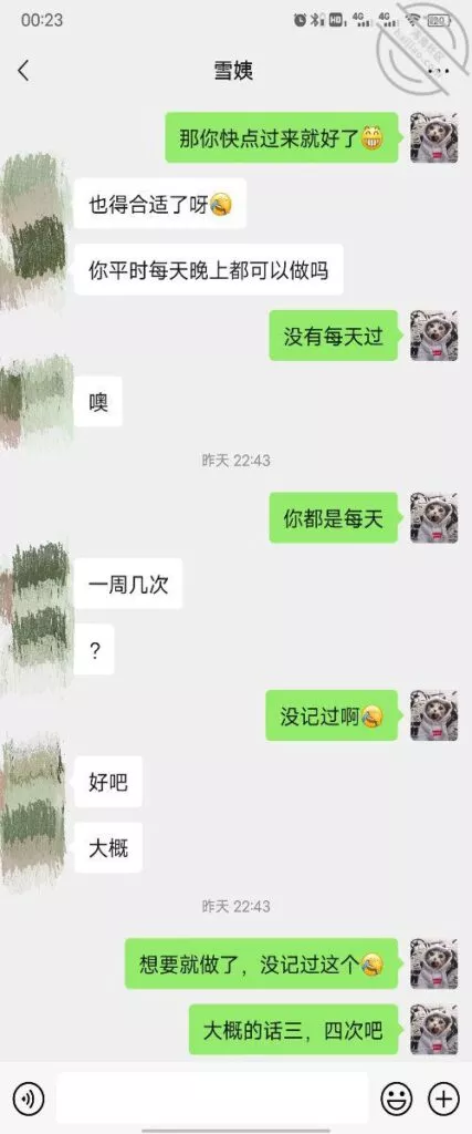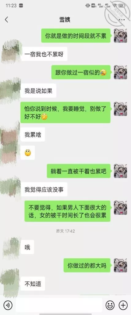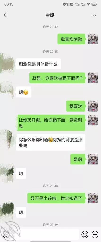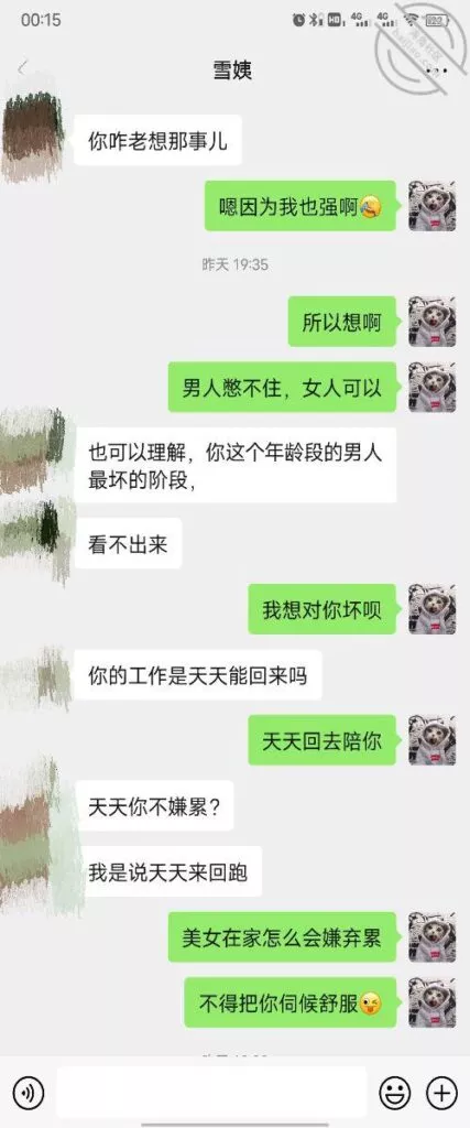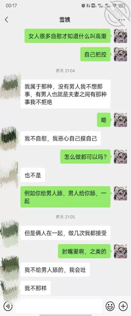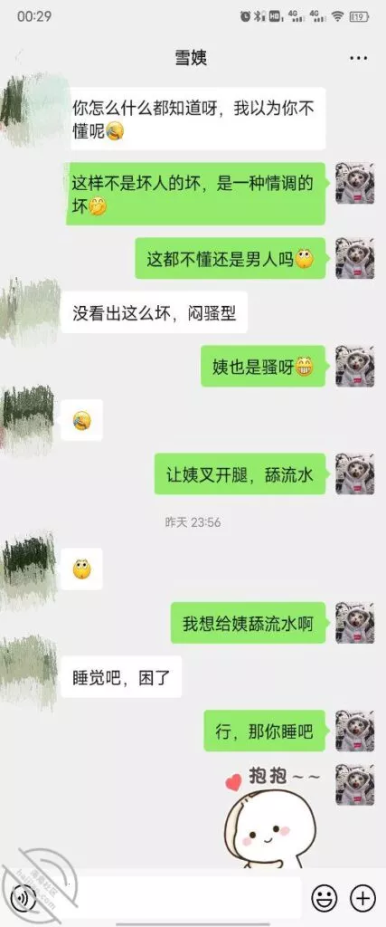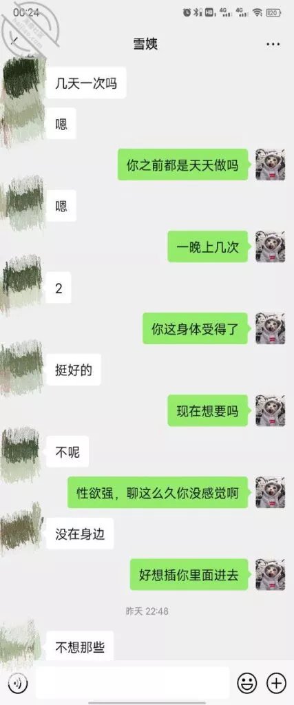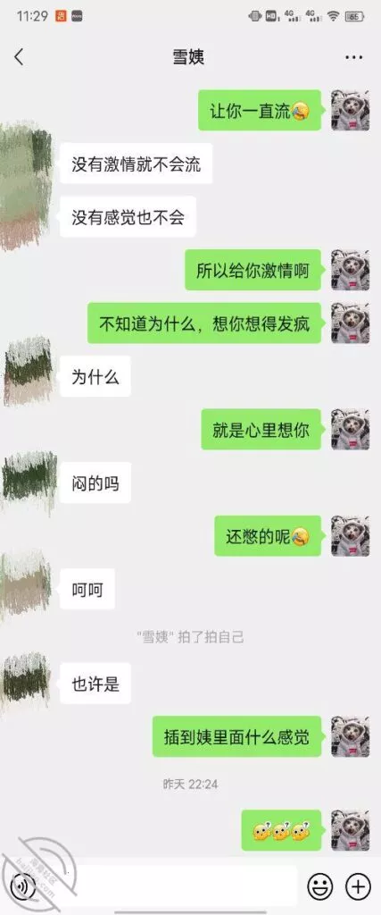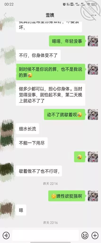 其实我忽然在想雪姨性欲这么强,每天要1-2次我这身体可撑不住啊 ,应了那句话,女人三十如狼四十如虎真是不假,,,自己都哭笑不得不说了,聊天记录都有了,自己看吧!