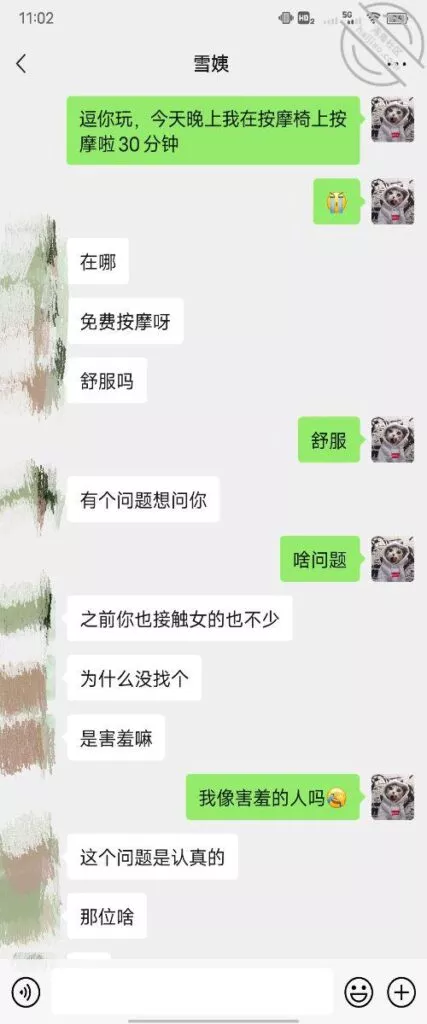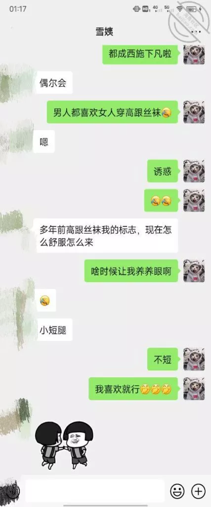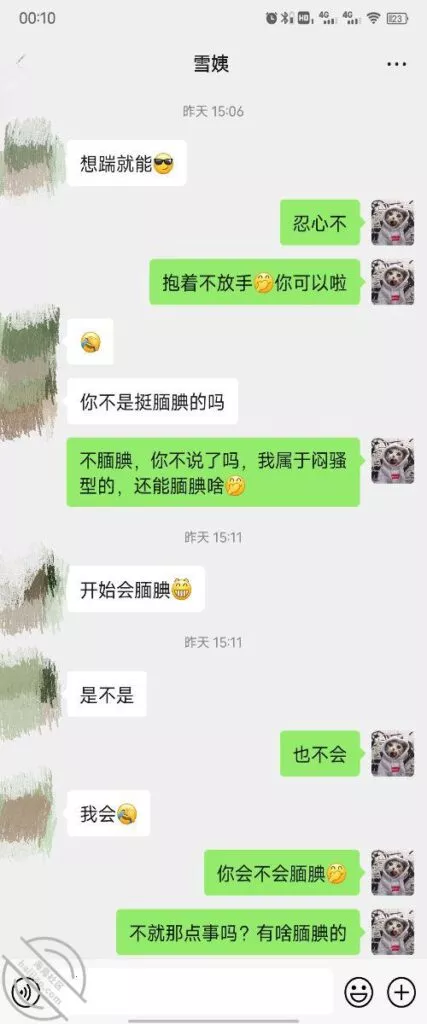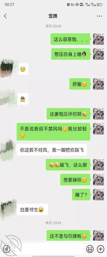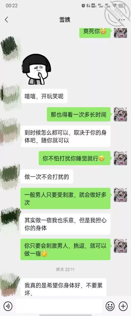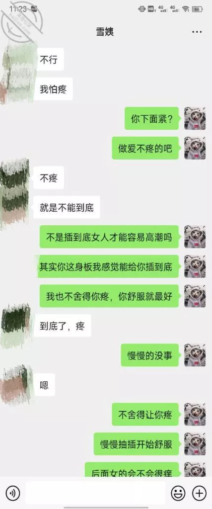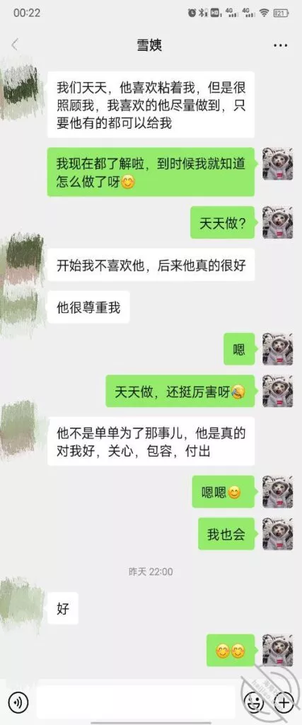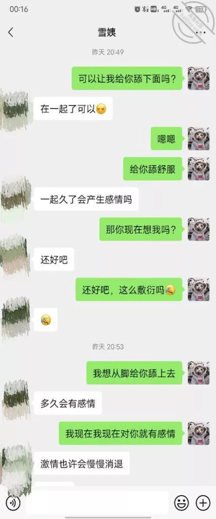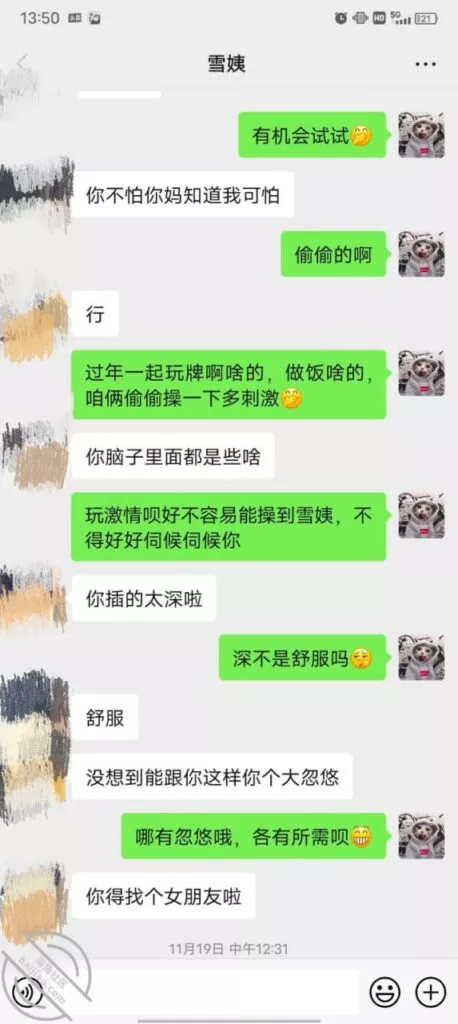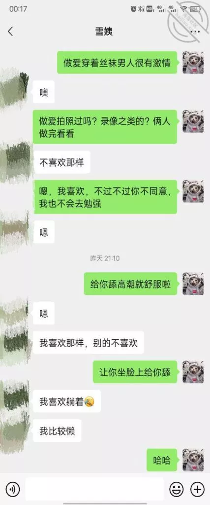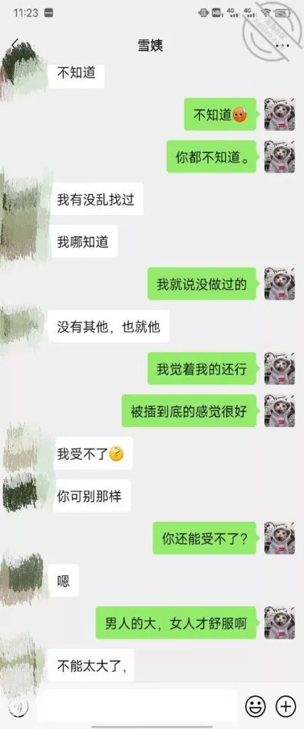 其实我忽然在想雪姨性欲这么强,每天要1-2次我这身体可撑不住啊 ,应了那句话,女人三十如狼四十如虎真是不假,,,自己都哭笑不得不说了,聊天记录都有了,自己看吧!