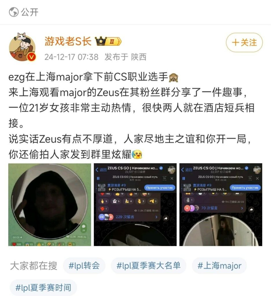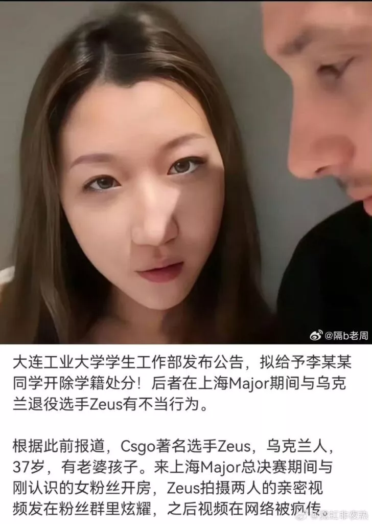 在去年12月的CSgo赛事上海Major期间,乌克兰职业选手Zeus在粉丝圈晒出与一位21岁上海女孩约会的视频。实际上,这名21岁女性已有男友,且选手Zeus也是已婚状态。此事发生后,引起互联网上对于easygirl一系列讨伐言论。
