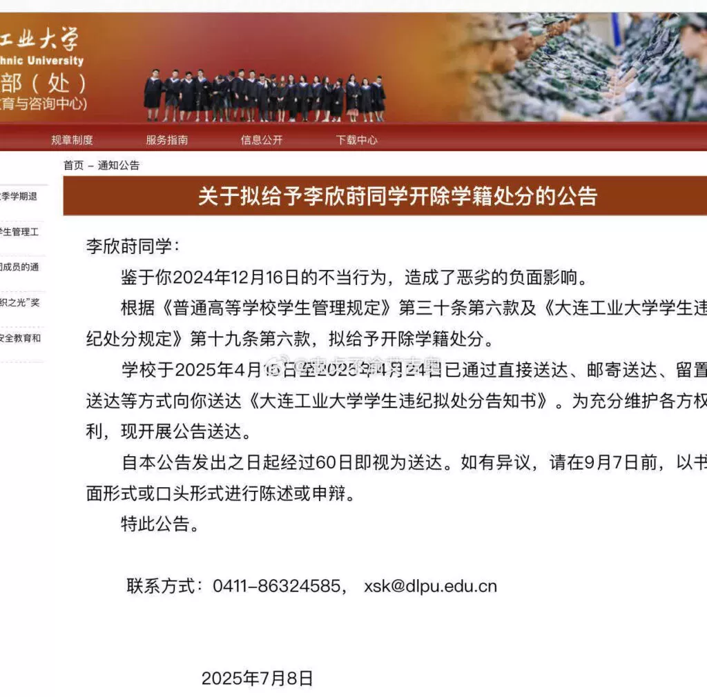 而在近几日,大连工业大学发布通告,这名女生已被学校开除处理。