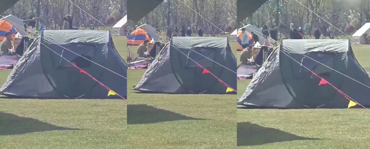 春天到了?大胆情侣公园露营搭帐篷野战看呆路人